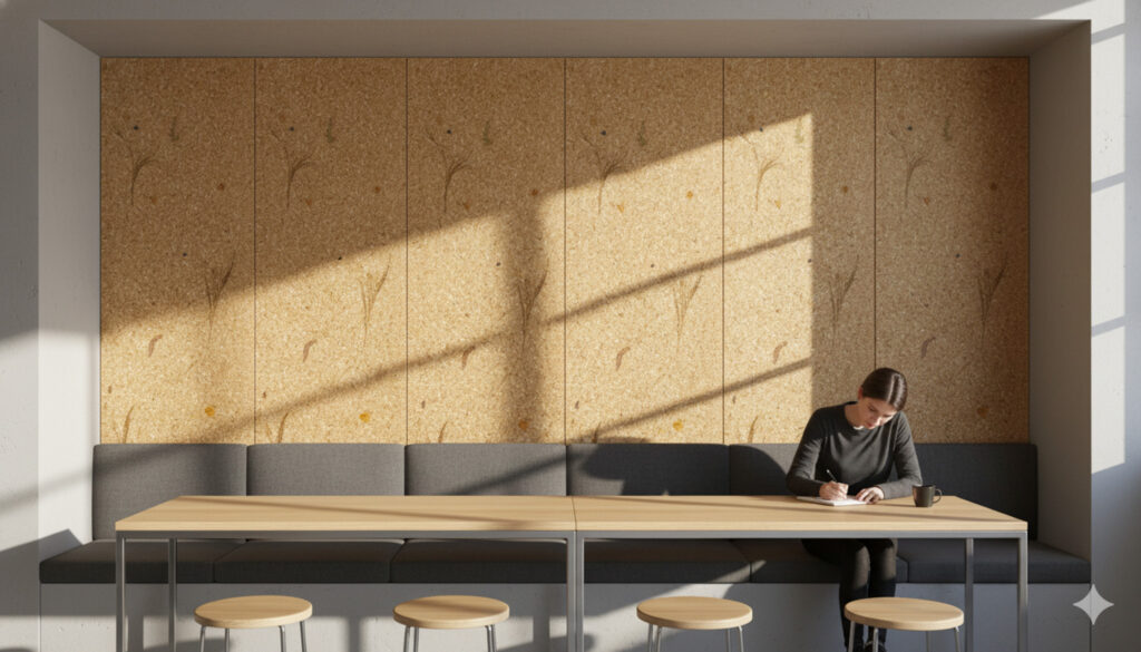 Wij leveren materialen op maat, we hebben een zelf ontwikkeld assortiment aan materialen. Gemaakt van gras uit de berm van waterschappen en gemeentes, platen uit hennep, vlas en paprika planten vezels. We werken met gelimiteerde oplages zodat het materiaal zijn waarde behoud over tijd.