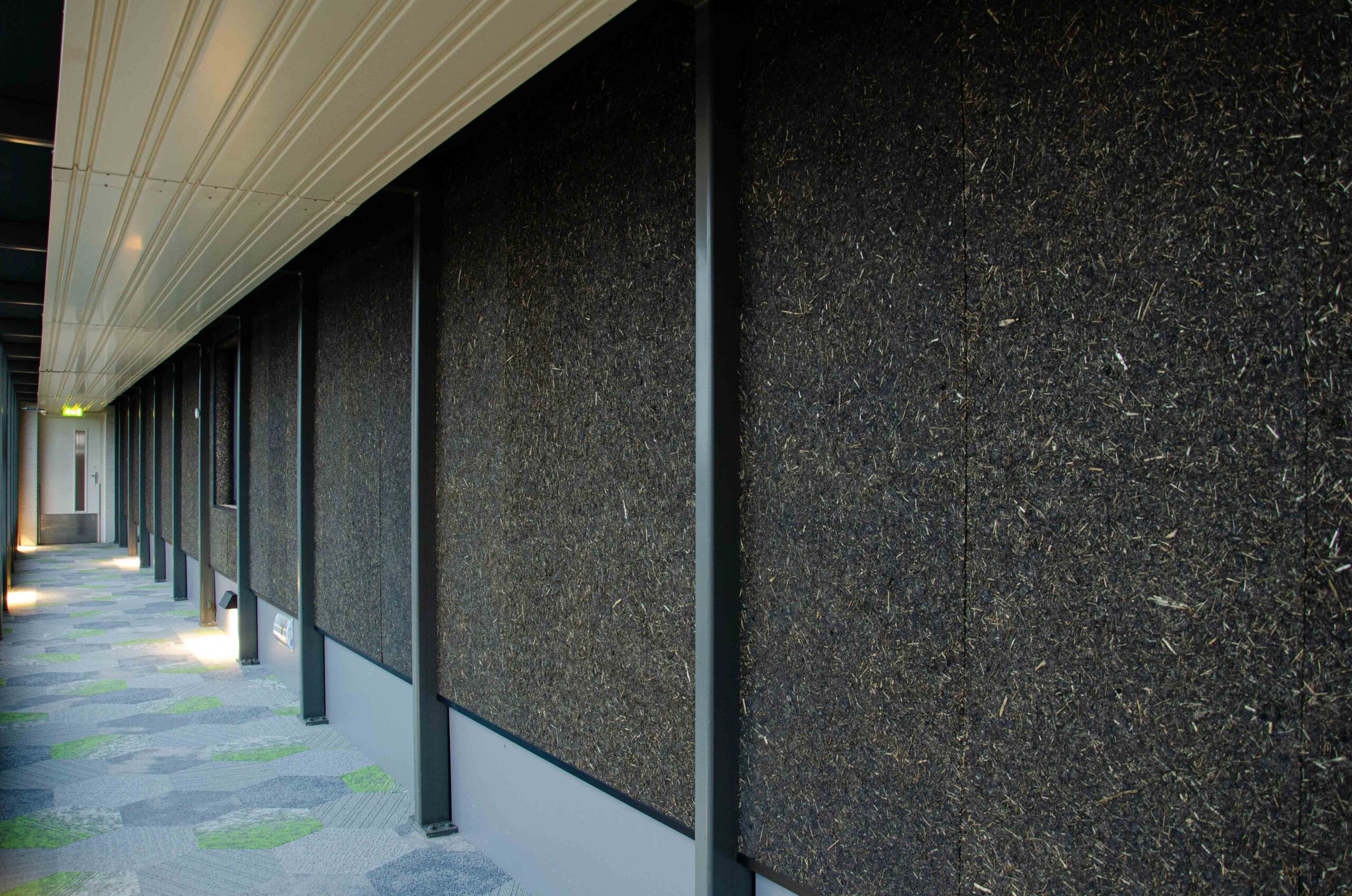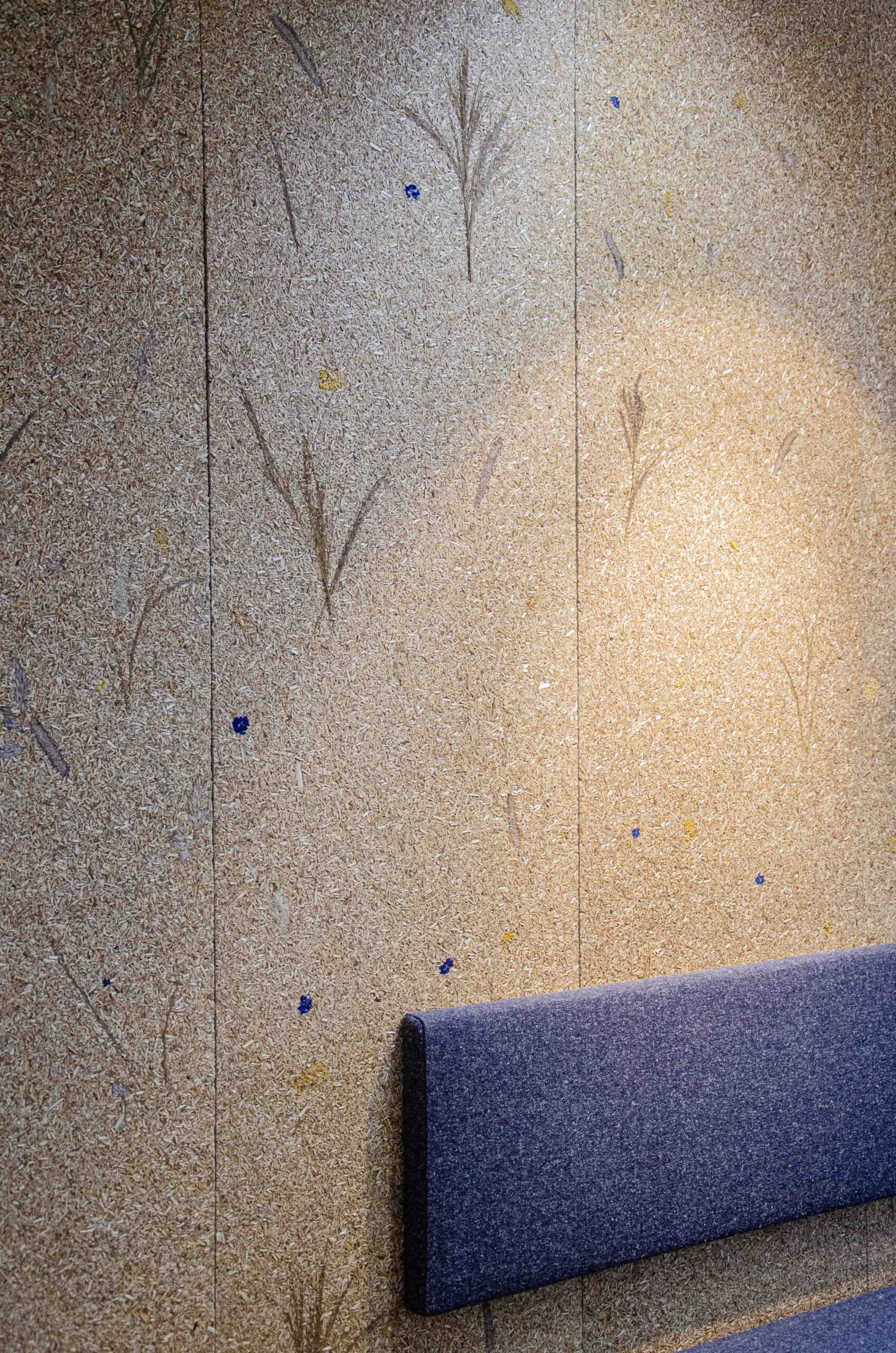The fibers come from the landscape the water authority manages every day. They are processed locally, turned into repeatable panels, and used to finish walls in their own offices. Short chains, clear origin, real application.