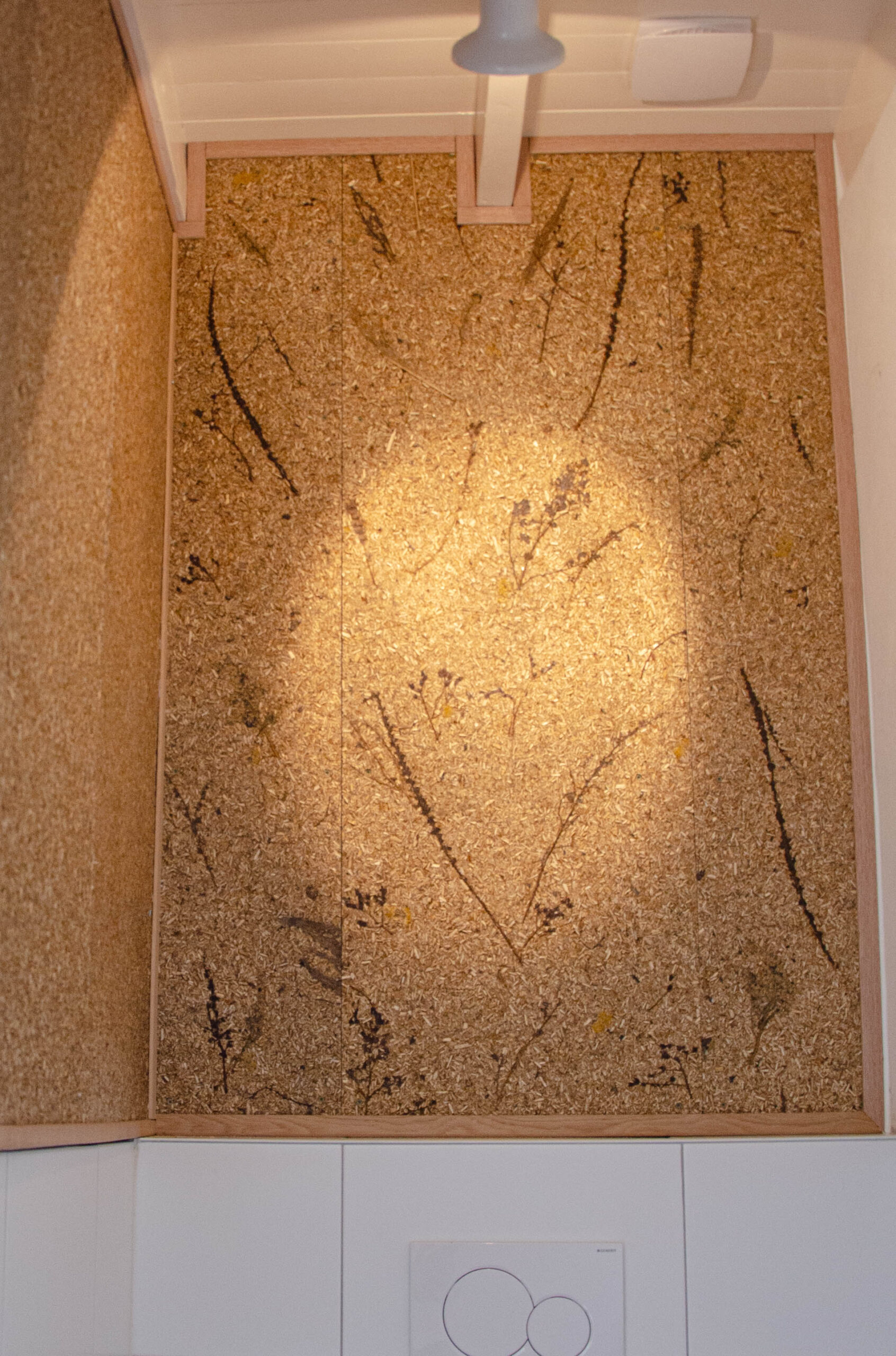 We designed, produced and installed the panels, finished with a refined solid oak edge detail. To make the project truly personal, the panels incorporate local plant fibers harvested directly from Ciel and Roel’s own garden.